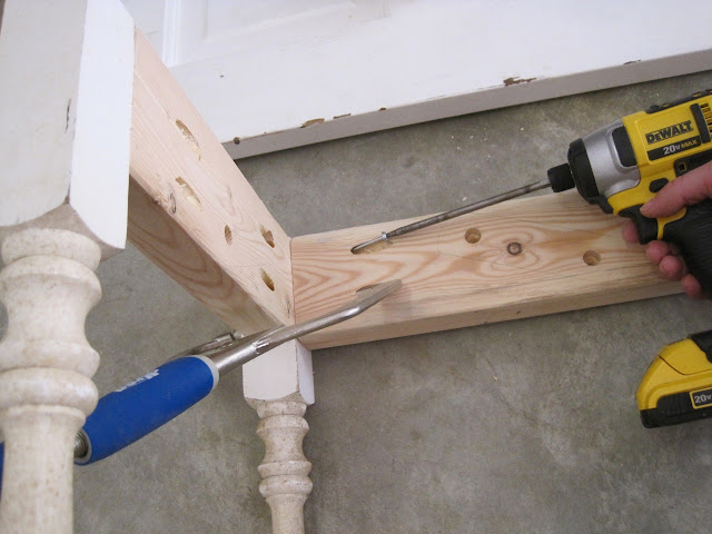 Attach the side 2×2’s to the bottom of the spindles. Use spacers underneath according to how high you want your shelf sitting from the ground (mine is about 3/4″). Tip: Although you won’t see the pocket holes if they’re on the inside, I did mine on the top side so the shelf would cover them and there wouldn’t be a place for spiders to hide 🙂 … this makes it more difficult to screw in (I had to use my right-angle attachment for my drill)!