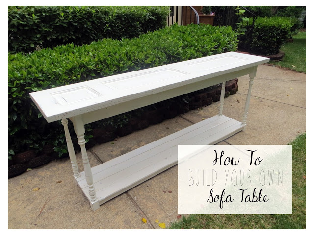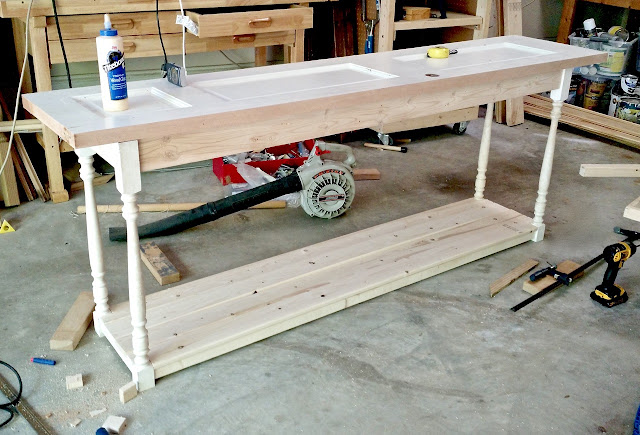 I found a beautiful solid wood door at Habitat for Humanity a few months ago along with some old railing spindles. I brought them home planning to make a table to go in front of a set of windows in our living room and I finally got around to doing something with it! I didn’t have a plan drawn out or know exactly how it would turn out in the end (I actually cut the legs shorter in the middle of the project and ripped the door slightly smaller-I’ll spare you the details and tell you how to make the finished product)… because I didn’t have a plan I hope this tutorial is easy to follow! To start off I gathered a bunch of lumber I had in the garage and brought it out onto the floor so I could see the pieces together and figure out what looked best.