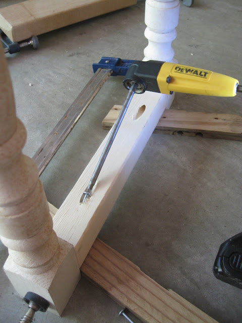 Clamp 2×4 side pieces to the top end of spindles and screw together with pocket hole screws (2-1/2″). Do this for both ends. Tip: Because my pieces are inset from the spindles I used spacers while attaching.