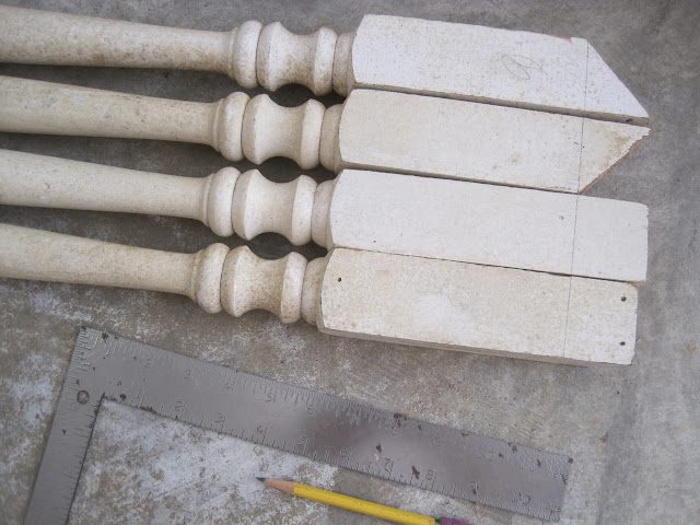 I lined up my spindles and made a line across each end to make them even with a total length of 28″. I made the top to have about 5″ of square for attaching my 2×4’s and the bottom about 2-1/2″ for attaching my 2×2’s.