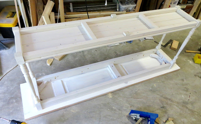 At this point I thought of how my kids would probably stand on the shelf and I added little feet to the center-bottom of the shelf. I used scrap wood from the spindles and made them the same height as the spacer I used for attaching the shelf brace to the spindles (about 3/4″) and used 1-1/2″ screws. TIP: Make the heads of your screws sit down into the wood so they won’t touch/scrap any floors it sits on.