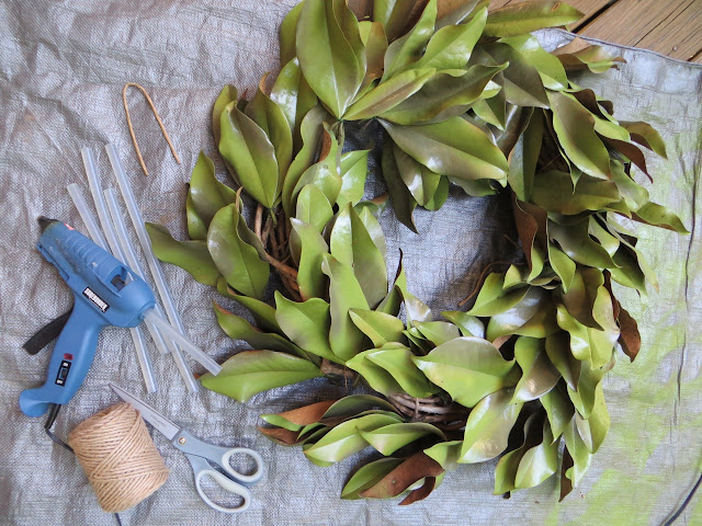 We have a magnolia tree in our backyard and each week we’ve been raking the fallen leaves and dumping them inside the chickens’ fence.  I’ve been noticing how they haven’t crumbled or disintegrated like other types of leaves.  Since I’ve been on a search for a wreath ever since we moved into our house this was just what I needed – realizing that magnolia leaves are the perfect candidate for a homemade wreath!
