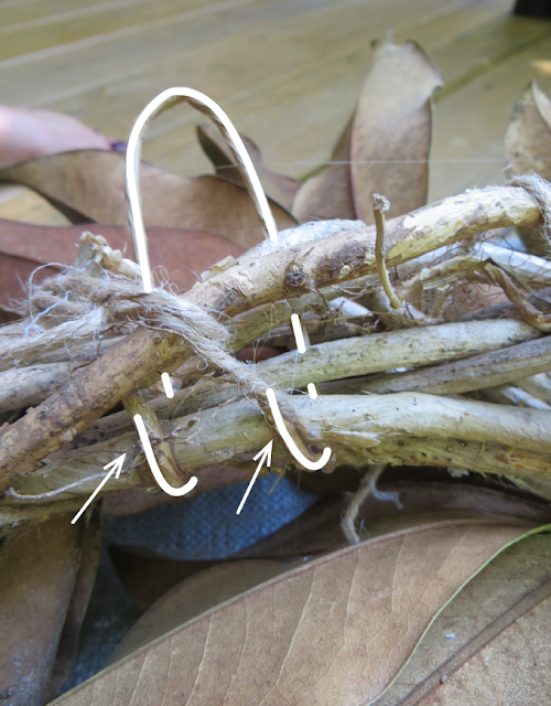 TIP: whether you’re buying or making your own frame you’ll want it to be large (say, 14-inches across the center opening) because not only is it hard to twist vines in a smaller circle BUT more importantly the magnolia leaves are very large and would be hard to fit inside the inner curve.