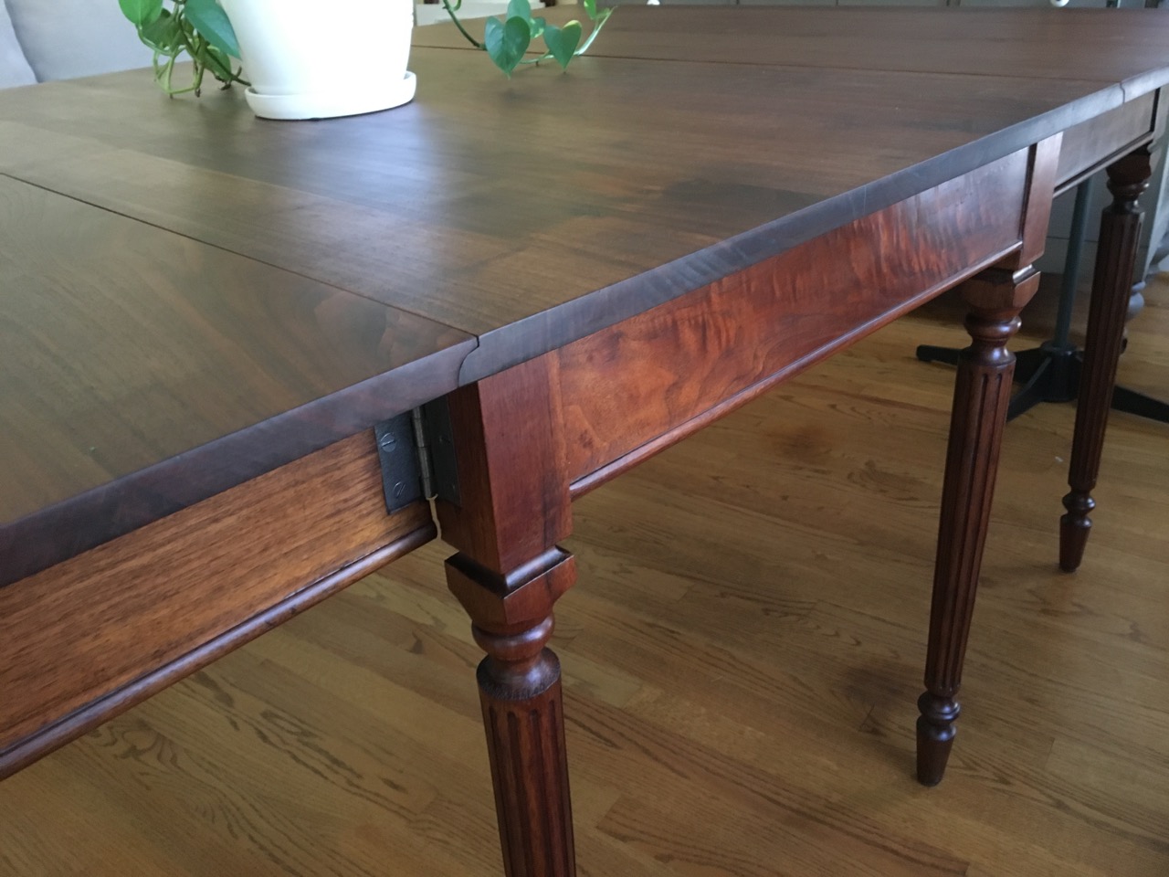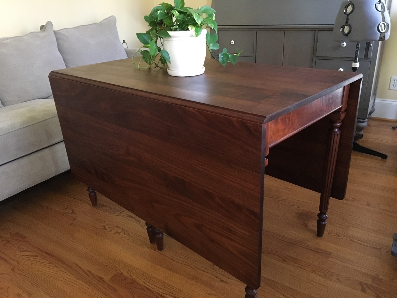 I fell in love with this gate-legged table as soon as I saw it at the thrift store. In it’s condition I knew it would require a lot of work. I loaded it up in my car and worked on it over a few months (it got put on hold for other-pressing projects). I’m not sure how old it is but I want to guess early 90’s because of the hardware used, and joinery + tool markings on the wood. It’s probably Walnut or Mahogany wood – super pretty!