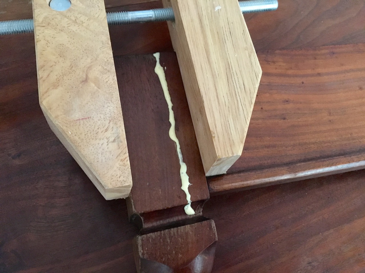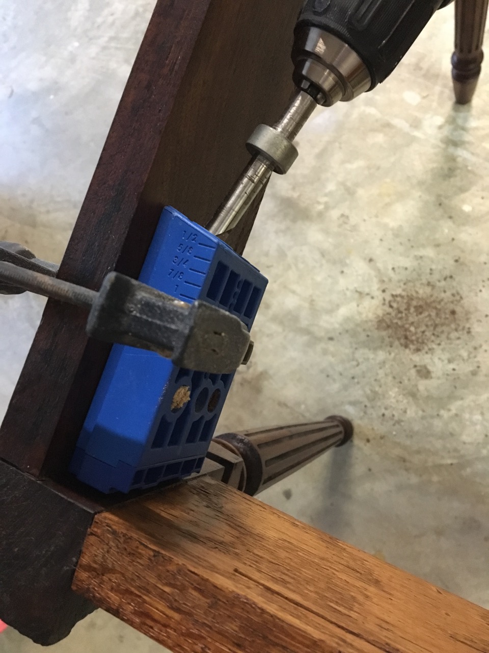 One of the legs was wobbly enough I had to reinforce it. I used my Kreg Jig to drill a few pocket holes…