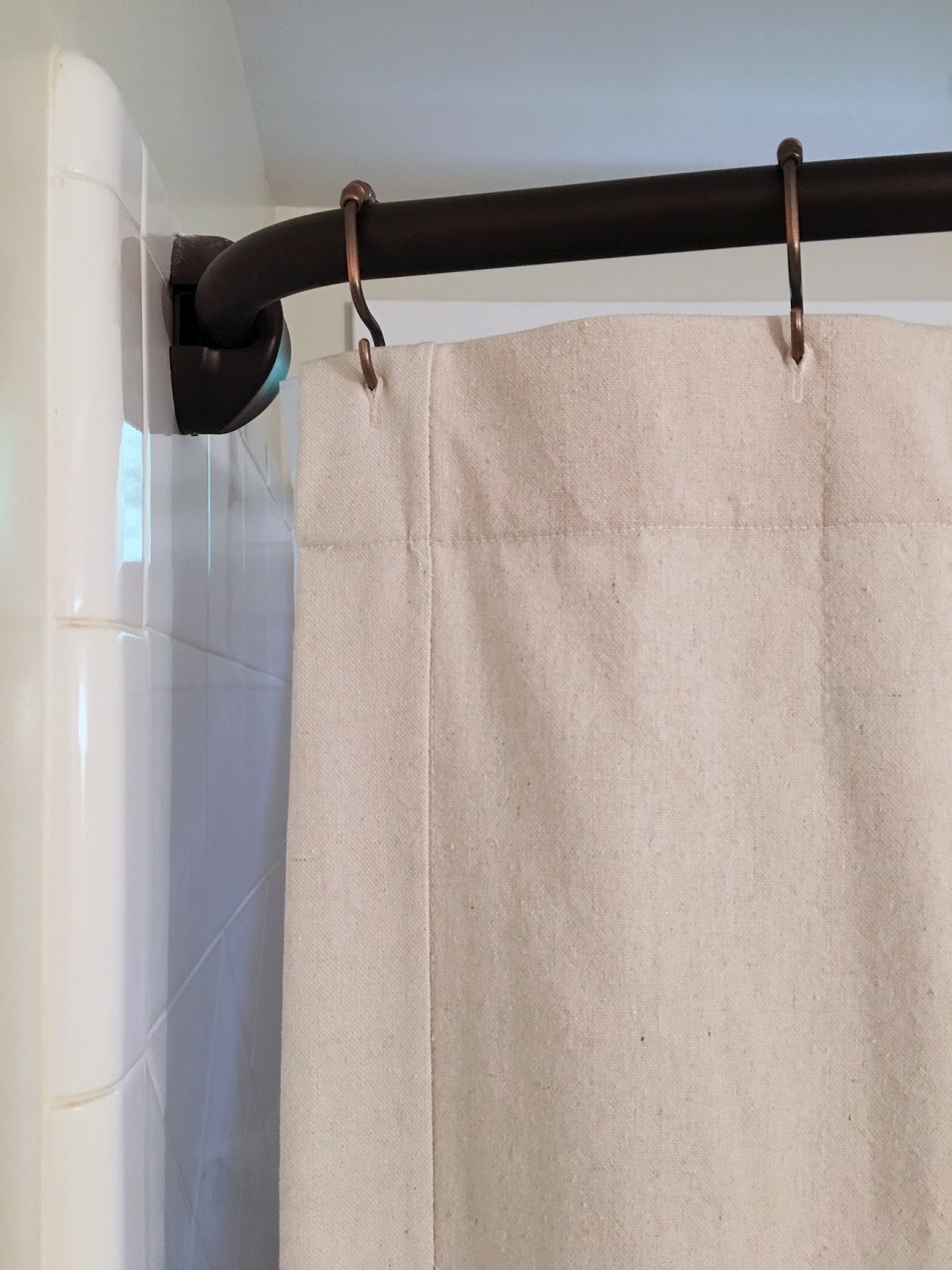 I bought a $10 painter’s drop cloth to make a shower curtain. I pre-washed/shrunk it which made it a few inches too narrow so I had to sew extra strips on the sides (looks better than a regular-old hem anyways)! I ironed fusible interfacing inside the top hem where the buttonholes were to go to add stability.