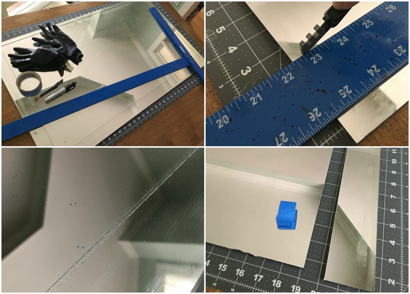 I finally found another mirror after going to several other stores-thank goodness! The mirror was about 2″ bigger on each side than my other mirror so I had to say a few prayers and hold my breath as I worked to cut off the extra. I felt pretty accomplished to not shatter the mirror to pieces! One of the biggest tips I can tell you is to tape your straight edge against your mirror so it doesn’t slide around while scoring with your tool. You want to score in one single pass with medium pressure so you hear a ‘ripping’ sound.