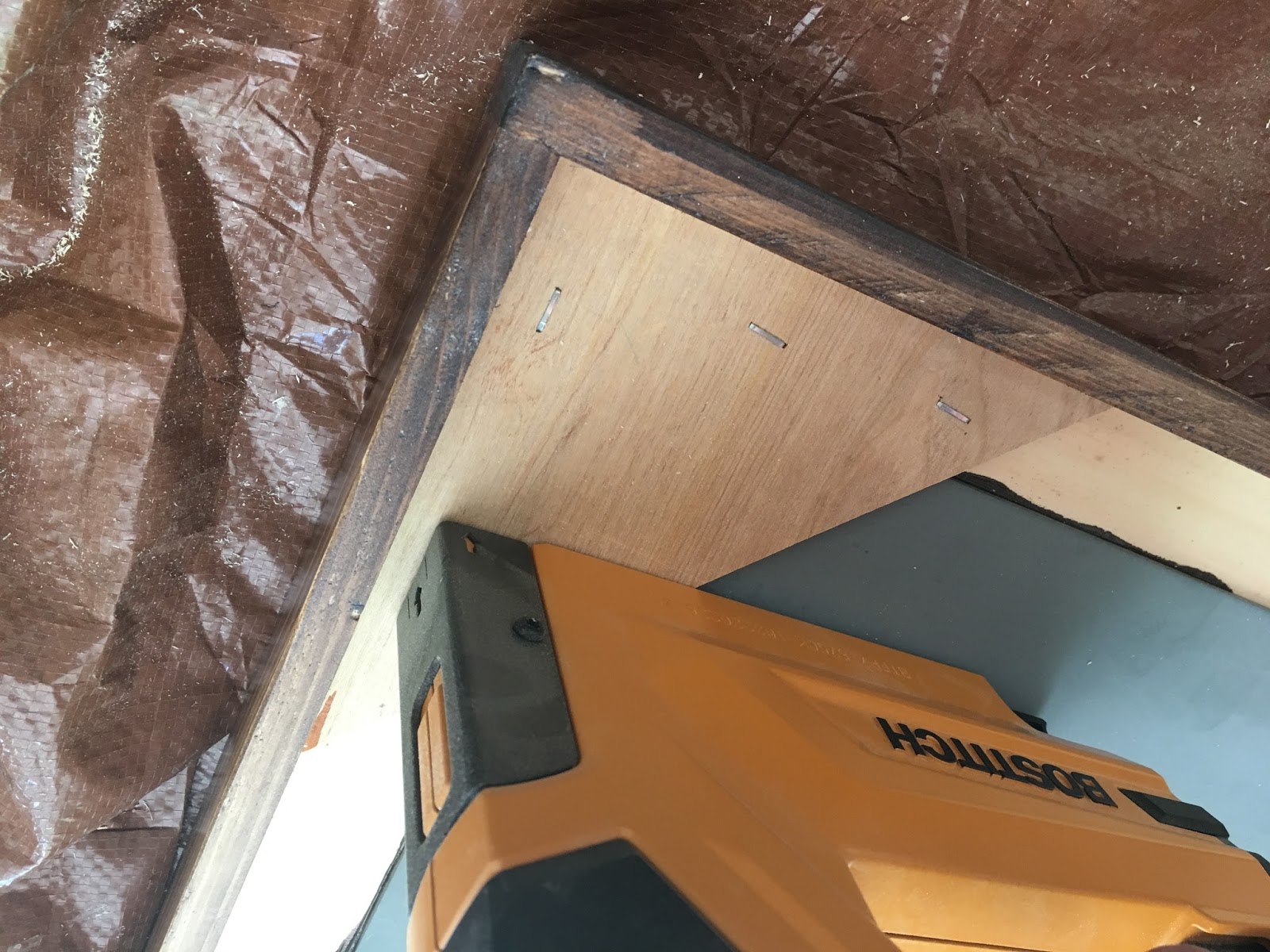 I used scrap plywood from the walls to staple the mirror down and into place. I can’t say enough good things about this Bostitch stapler!