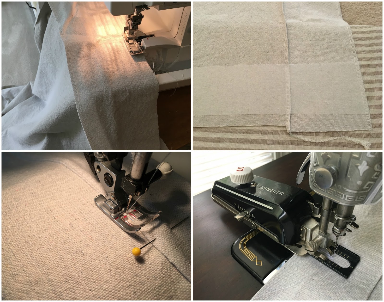 I bought a $10 painter’s drop cloth to make a shower curtain.  I pre-washed/shrunk it which made it a few inches too narrow so I had to sew extra strips on the sides (looks better than a regular-old hem anyways)!  I ironed fusible interfacing inside the top hem where the buttonholes were to go to add stability.