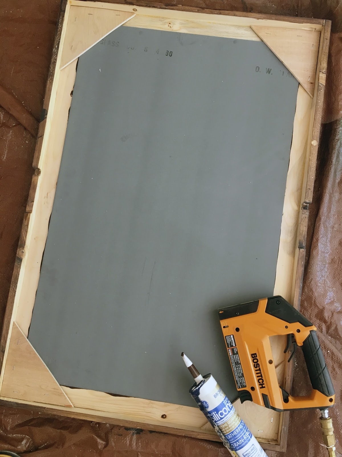 I used scrap plywood from the walls to staple the mirror down and into place.  I can’t say enough good things about this Bostitch stapler!