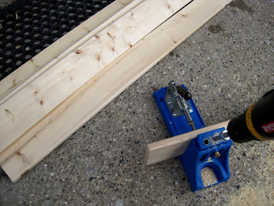Next I used my Jigsaw to make pocket holes along the wood planks that were going to make up the bottom of each shelf. I wanted them to be strong so I chose to attach them together. After doing the pocket holes I screwed the shelf bottoms together.