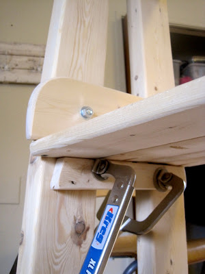 I cut some small strips of wood to put underneath each shelf, then I clamped and screwed into place.