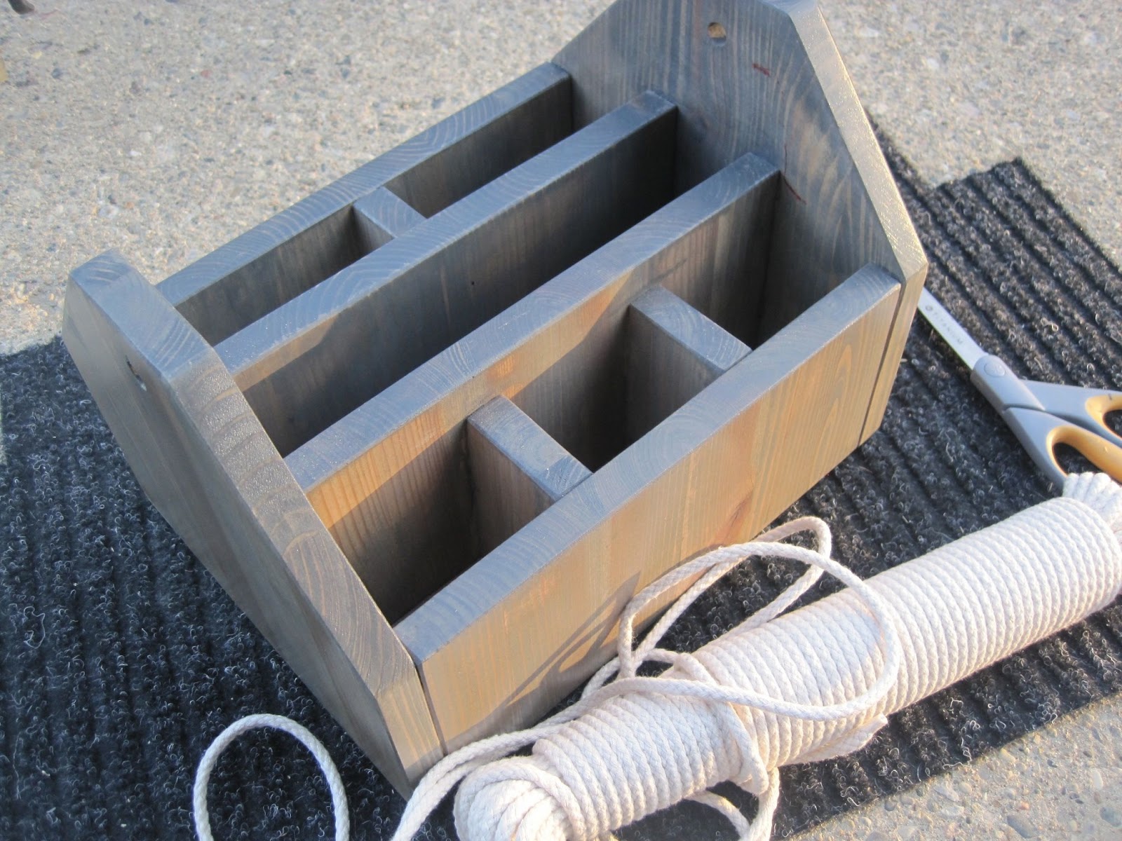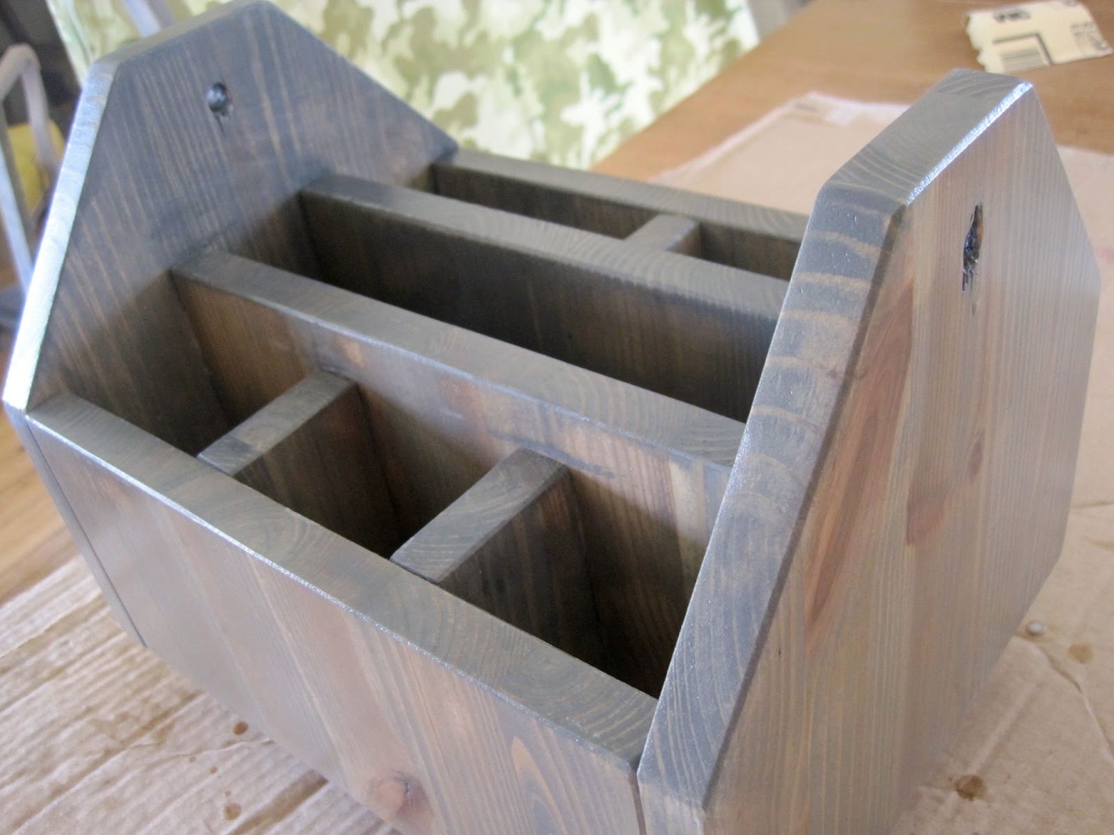Step 10 – Paint or stain your organizer. I used Minwax Gray stain. I love it! (I purposely left some areas bare for a worn look). Sand lightly and wipe off surface for clear coat.