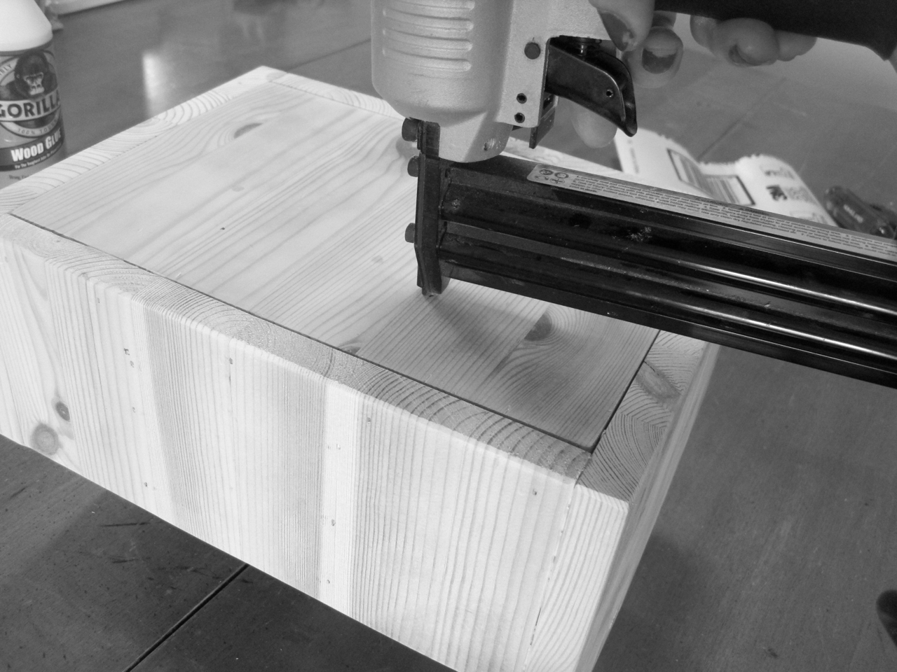 *TIP: When using a nail gun, you need to have the nails going in with the grain! See in the above picture how the lines (grain) of my wood are and my nail gun is angled? This is right. If I turned my nail gun upright my nails would be cutting across the grain and not go straight through to the small divider piece, but would instead go off to the side. Pulling these finish nails out is not fun!