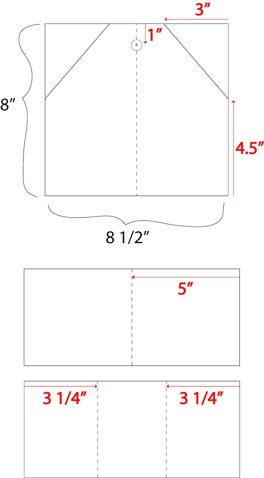 On both end pieces measure and mark 4.5″ front the bottom corners, then 3″ inward from the top corners. Connect both marks for your cut line. For the handle holes, measure and mark 1″ down from the center of your pieces.