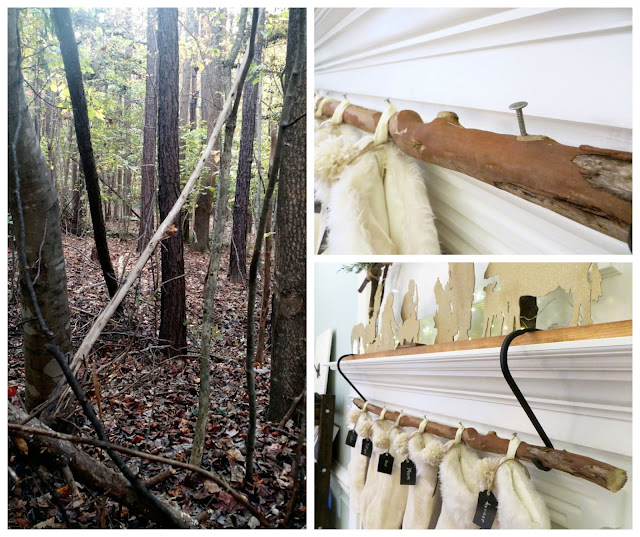 For the rustic branch I took a walk through our backyard and saved some wood from rotting on the ground – that makes me feel good! The branch was too thick for the stockings to slide on so I decided to hammer in some nails.