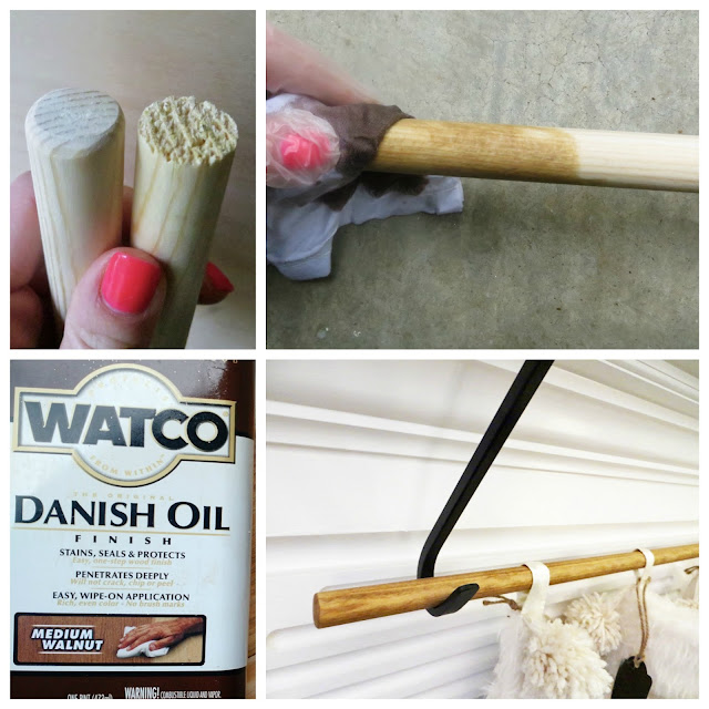 For the dowel I used a full 48-incher, sanded the ends and rubbed some Danish Oil on. Super easy to slip the stocking loops on, too!