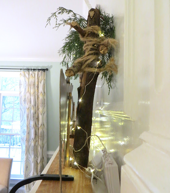 For the rustic branch I took a walk through our backyard and saved some wood from rotting on the ground – that makes me feel good! The branch was too thick for the stockings to slide on so I decided to hammer in some nails.