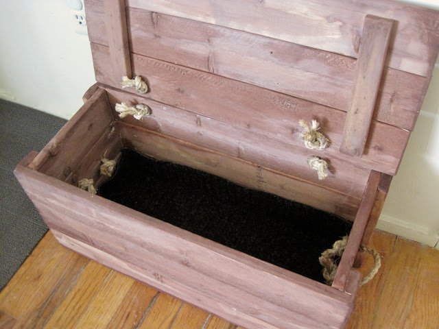 Winter with kids = winter clothes all over the house. Since we don’t have a garage or a mud room in our small apartment I decided to make a coat rack and a boot box to put by the front door. The coat rack hangs on the wall with some heavy-duty d-rings I screwed into the back. The boot box is a smaller version of my wood storage chest I posted earlier. I added a rubber mat in the box to absorb water and snow. Because I put detailed photos for the wood storage chest in my other post I won’t put as many here.