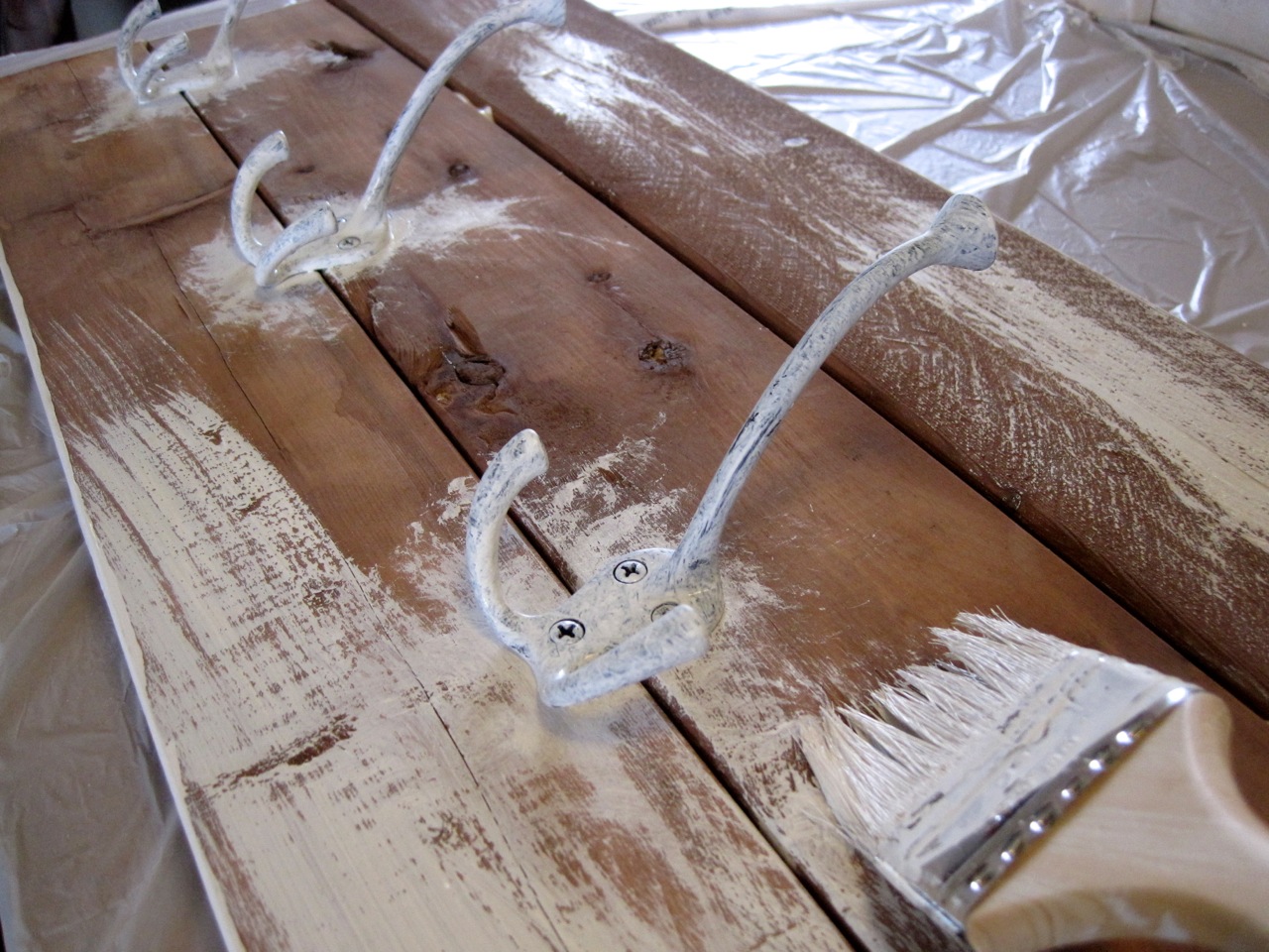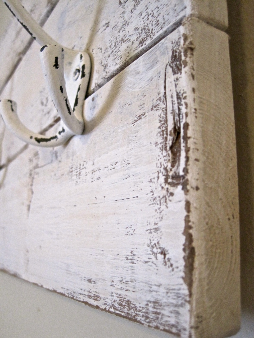 Step 5 {optional} – Sand your corners to let the stain show through for an even more worn look. I also used a razor blade to chip away at the paint on the black hooks to let the black show through a little.
