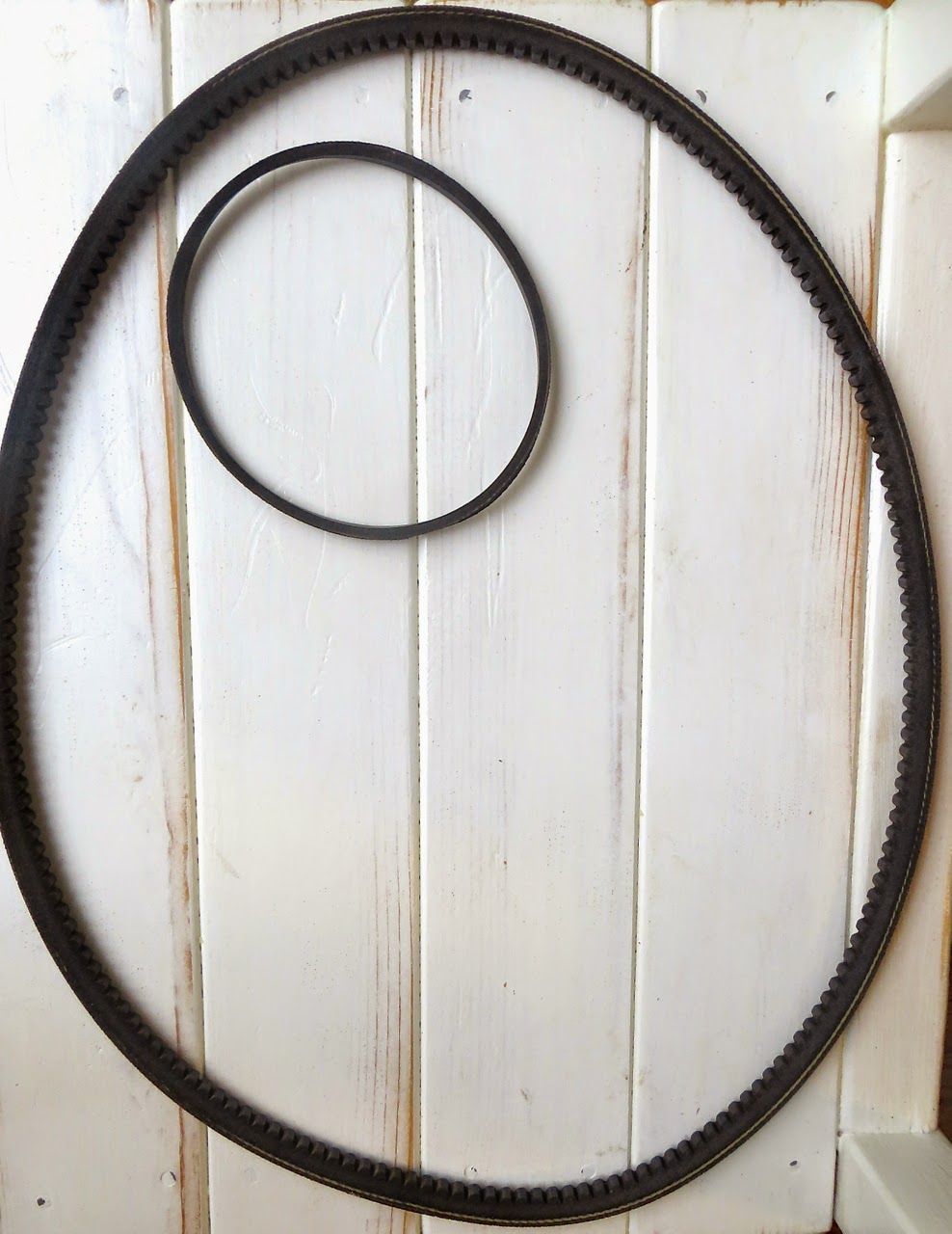 Here we have the belts. These belts drive the machine by turning the hand wheel from the motor pulley. Pictured is a belt from a Singer 66-16 and the industrial belt.