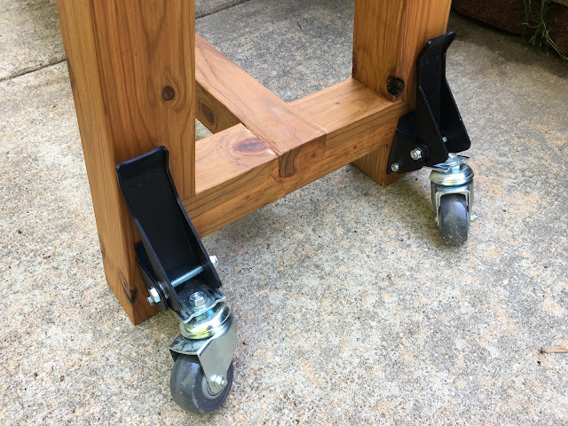 As a side note: I got the “workbench” casters from Rockler. For being $59 I would have hoped they’d be easier to engage/disengage. It’s pretty awkward because you want to engage/disengage both on the same side together and that means you’re using your hands to be able to do that OR you have to pull up on the table while using your foot to do one at a time. When disengaging them, they don’t always drop the table completely and you have to move it back/forth for the casters to fold over to one side to drop the table fully. Also, when going over the lines in concrete they tend to get stuck – if you pull up on your table to get it un-stuck the caster(s) lower further and fold down underneath your table leg (ugh)! They’re sturdy casters and will last but they’re exceptionally frusterating to operate.