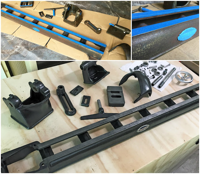 Because lathes are very simple machines it was very straightforward to disassemble (thankfully). I stripped the paint off the body castings, scrubbed and power washed everything and dried all the pieces super well. Masked all the ‘bare metal’ edges and primed+painted.