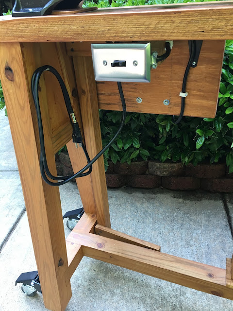 These are all the supplies I used. I was so happy to find an electrical box that would be easy to mount underneath the table! A few other differences from my previous post: I didn’t buy an extra piece of black cord to go from motor to switch and just cut a section from the replacement cord I was using. I also used clips with nails for securing cord underneath the table.