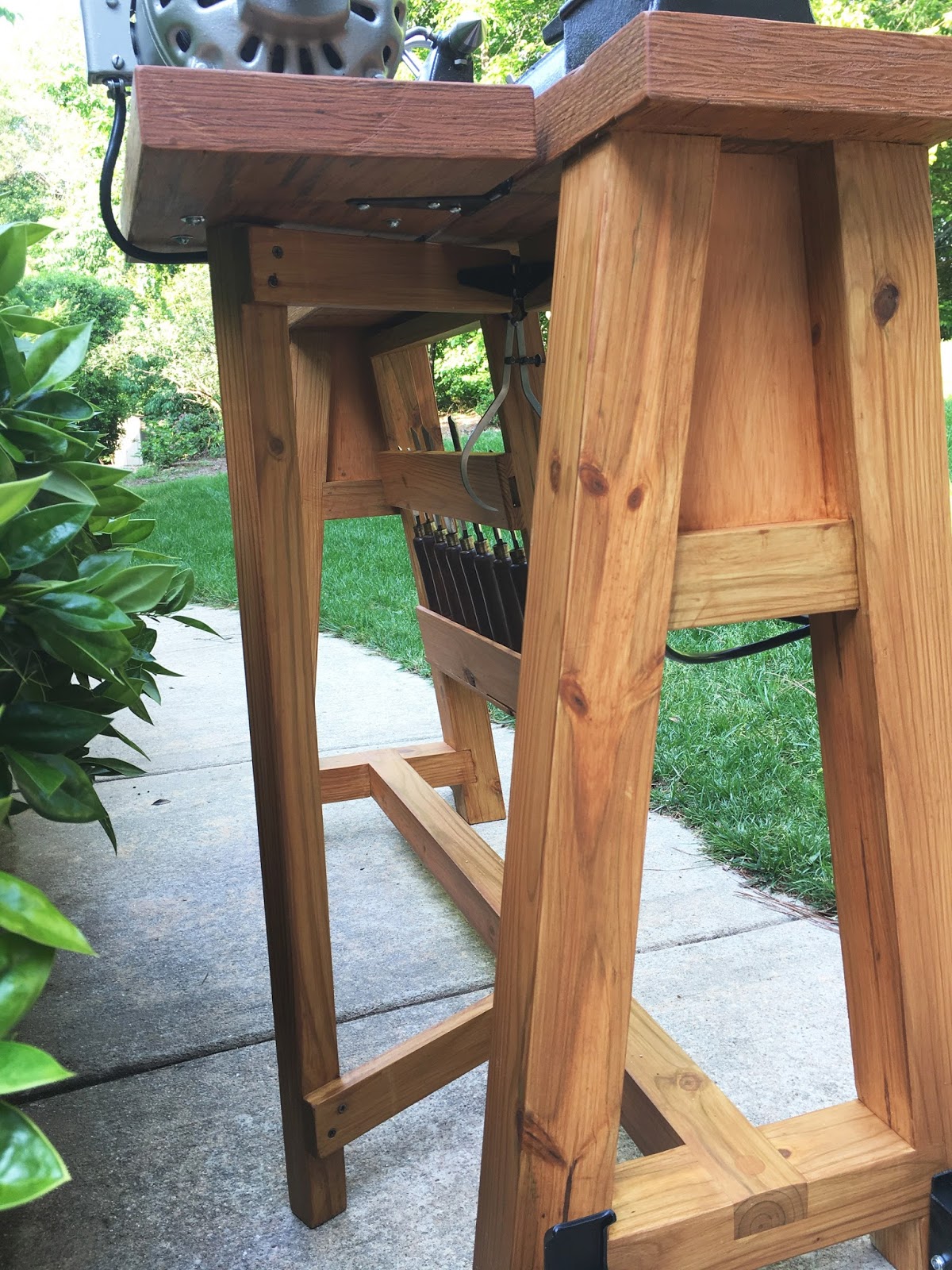 Before disassembling everything I thought I should figure out something for my turning tools. I had an old kitchen knife strip magnet in the garage and incorporated it into the design. I wanted something simple that was easy to hang from the table. I used a few hinges and it hangs with a nice angle on its own.