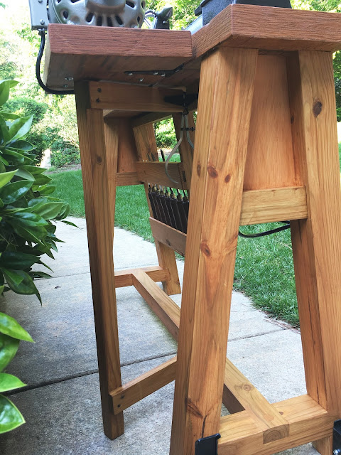 I used Flood outdoor stain and rubbed wax on the top to give a smooth finish.