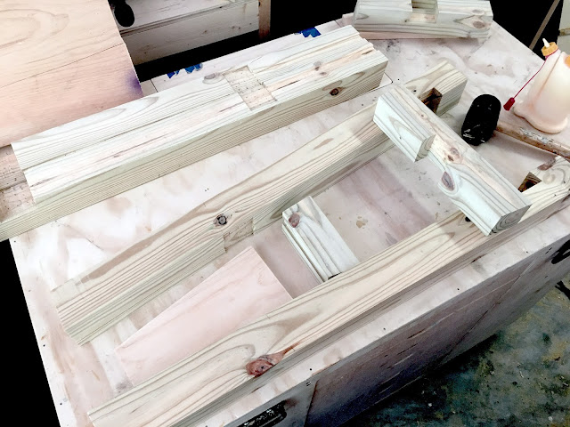 Once the legs were glued I attached the brace that runs between with a lap joint + dowel, then glued + screwed the top on. Next I made the stand for the motor to sit on.