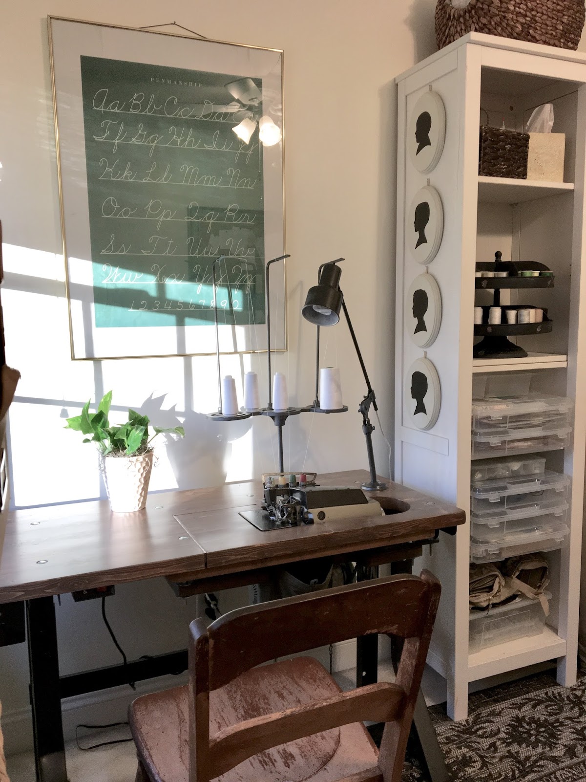 The tall shelf WAS in the little boys’ room but since Mr. Toddler pulls everything off the shelves during nap time I decided I would claim it for myself.  The overlocker machine was a Facebook Marketplace find!