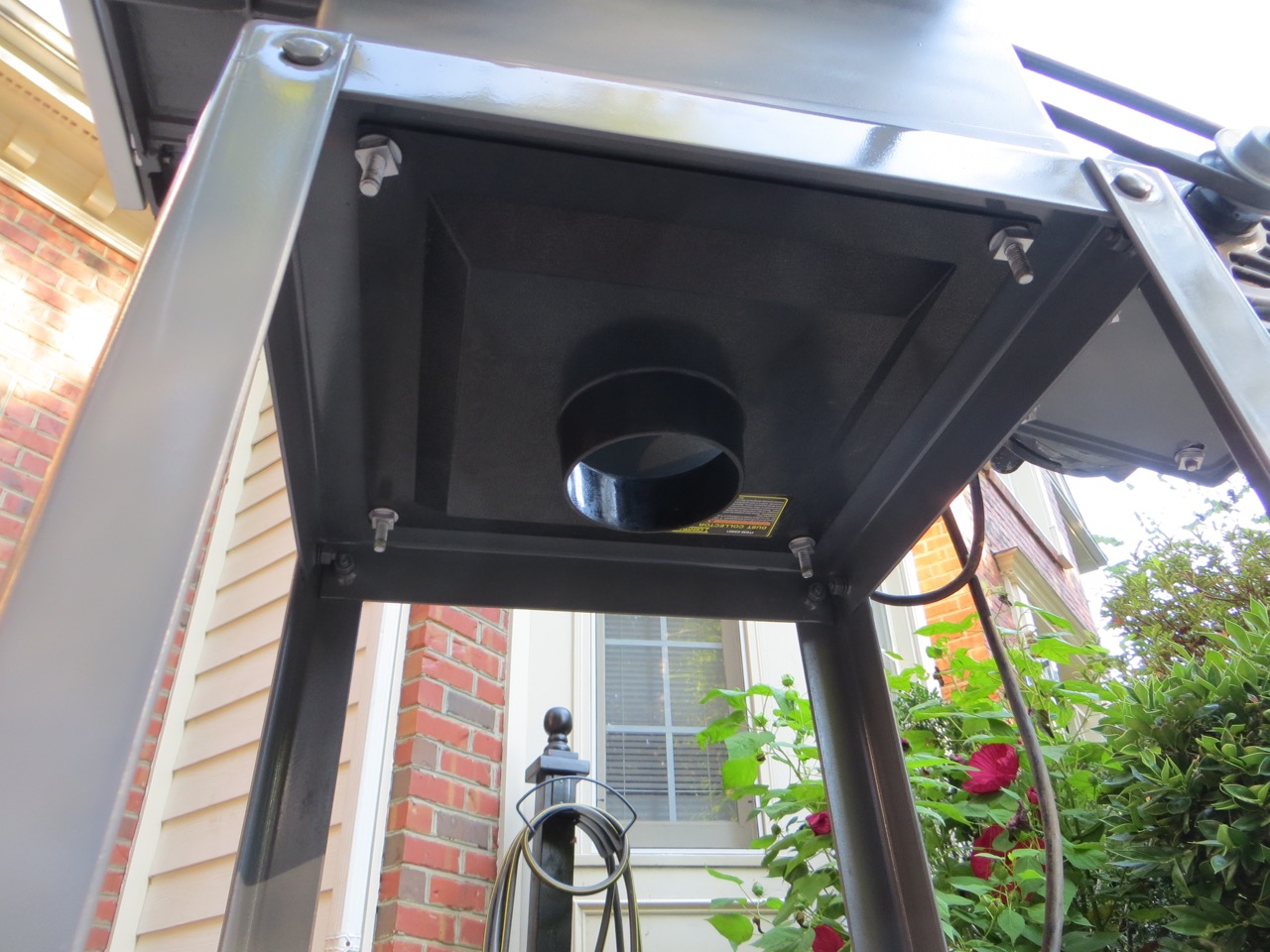 The plastic hood came with my dust collector and I was so glad to see that it fit the hole underneath the saw & base… so I drilled holes for the bolts to go through that hold the saw onto the stand.  I love when things work out!