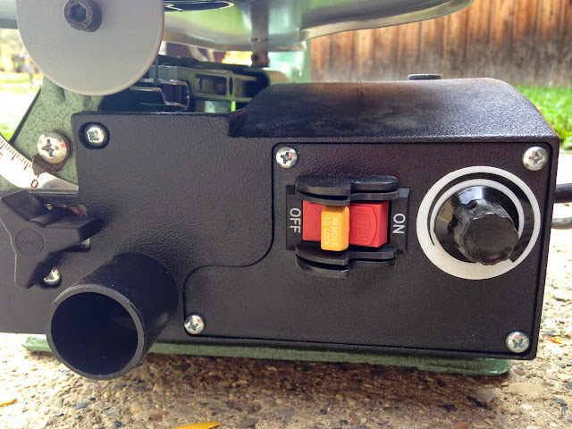 Here’s looking underneath the Harbor Freight saw. It has a dust collector that you can hook your vacuum up to. The on/off switch and speed control are a little awkward to get to because you have to bend down to see under the bed of the machine.