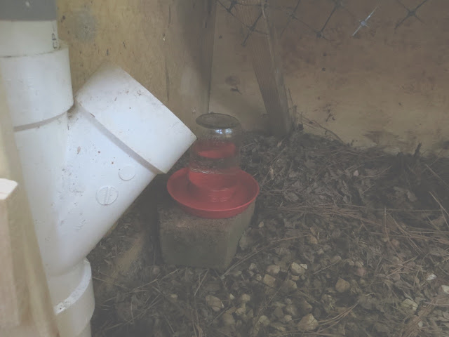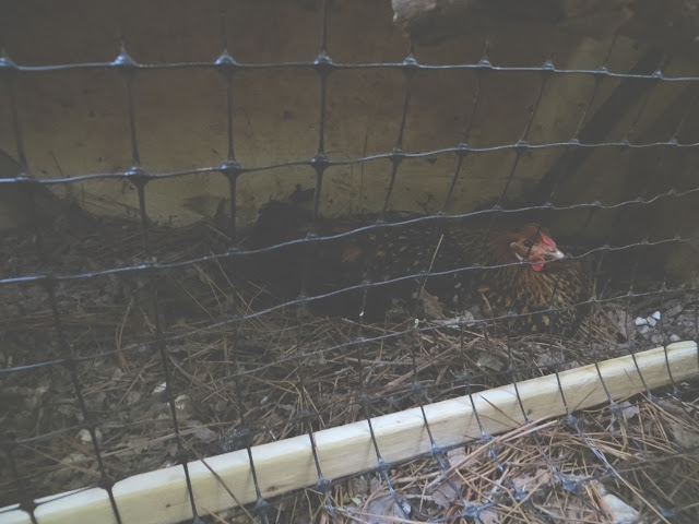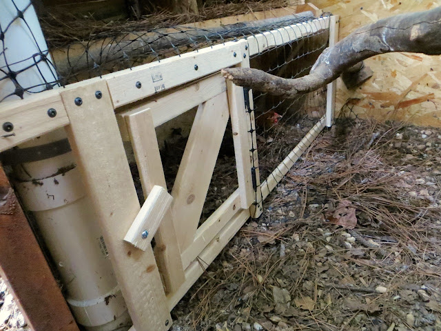 I came up with a little ‘fence’ that has a door for accessing the eggs, water, food and letting the little gal out if needed.