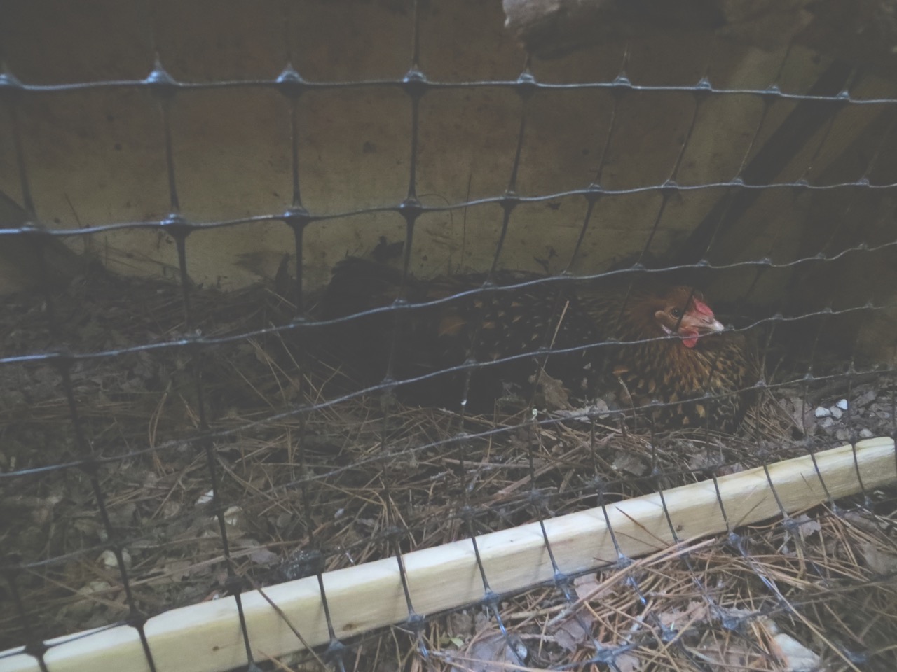 I didn’t want to make a separate enclosure for her away from the coop like I was reading about – not just because of the supplies/time it would take to make but because if I separated her I worried she would be even more on the ‘outs’ with the others. The area under our nesting boxes seemed like the perfect place to make a little brooding area – it was dark, the ground was clean and soft, protected from predators/elements and she would still be with the others.