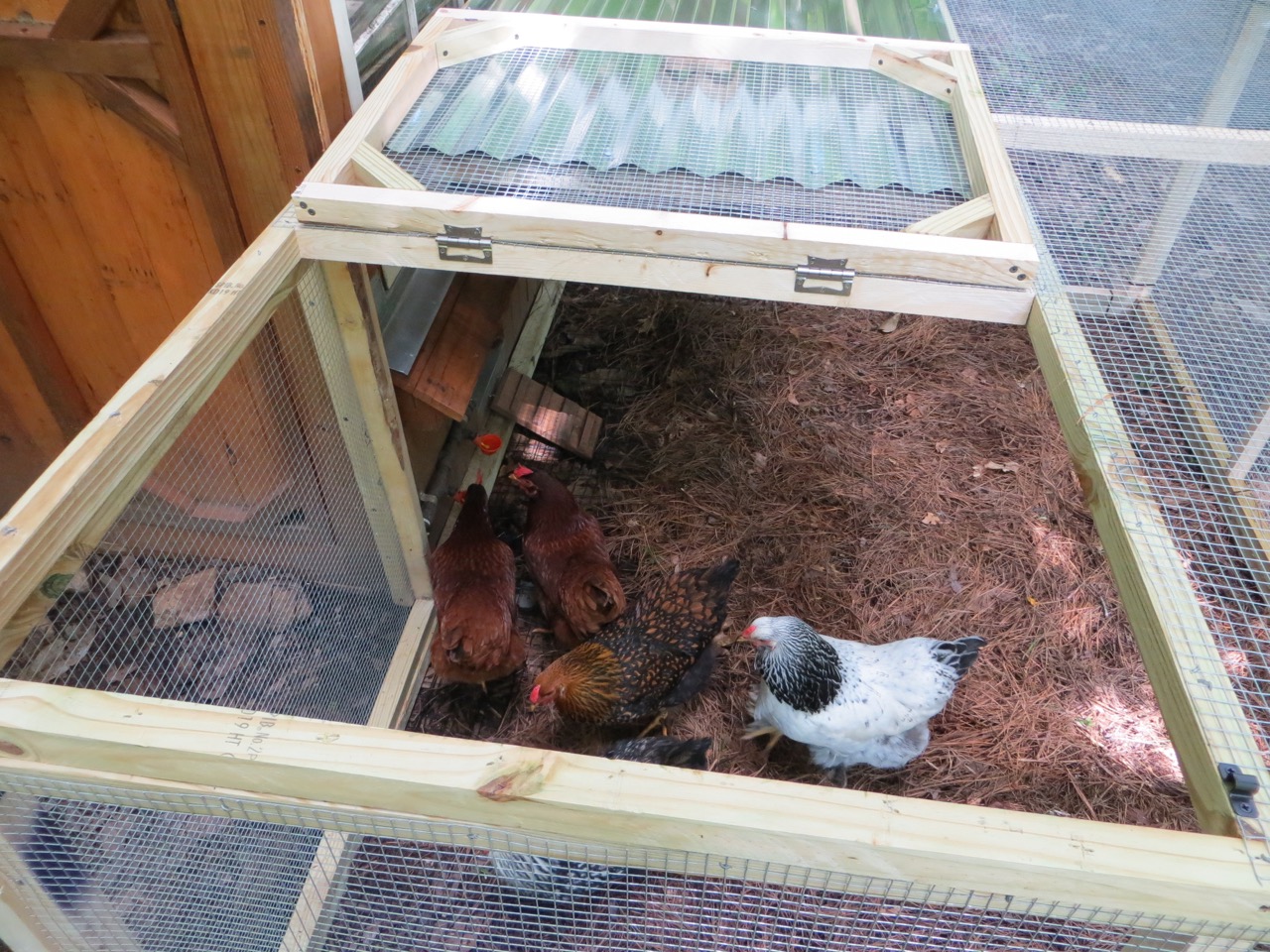 Realizing we might need to get inside the run to gather mis-layed (I made up that word) eggs or unclog the chicken watering cups I decided to take an extra hour and make a hatch door on the top. I wasn’t thinking very well in my mad rush to get it done and should have put it on one of the side so it was easier to get into – oh well.