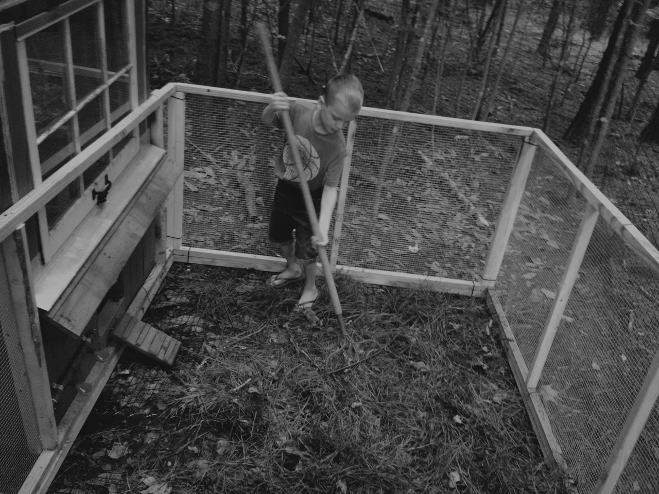 My son helped me put down a layer of pine straw and leaves from the forest.