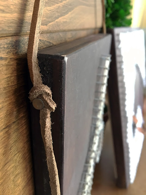 For the “A” I hammered larger nails in the top corners and tied a leather string onto it.