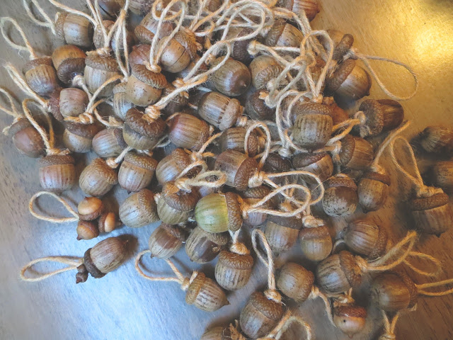 I slipped my acorns on my rope so there was one for every knot cluster. The knots keep the acorns in place while on the tree.