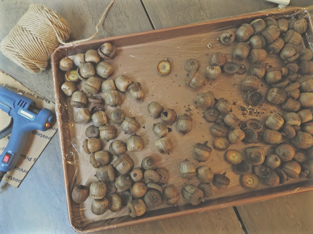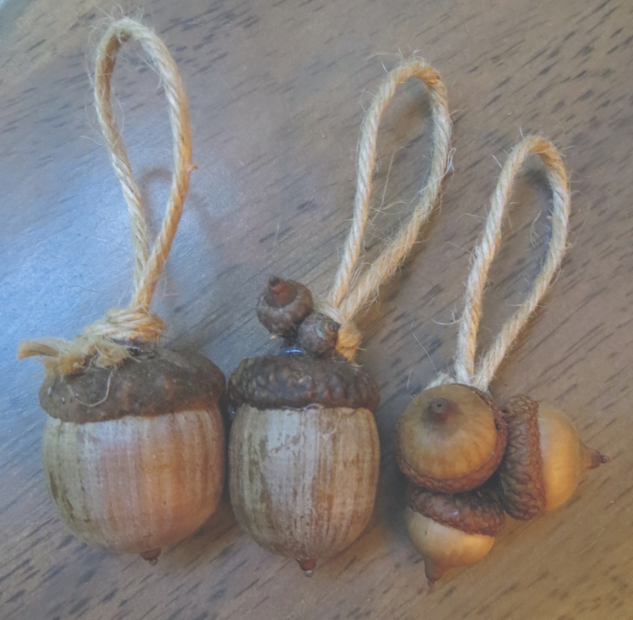 If you want to make a garland with your acorns, you may consider tying loops onto your rope first and THEN gluing your acorns to the loops. Mine shift around but that doesn’t bother me enough to untie all the knots on my rope and tie the acorns on individually.