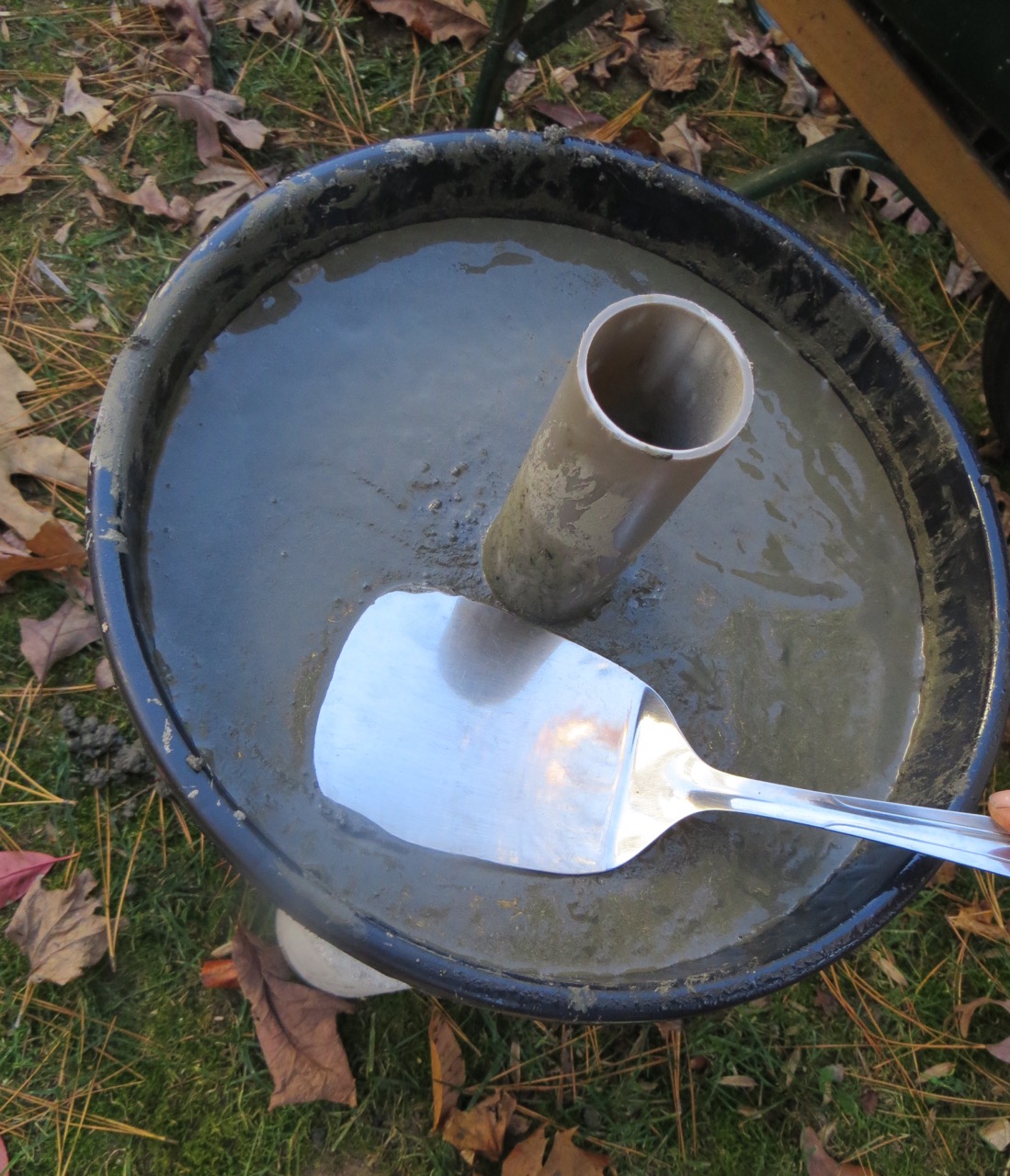 After 24 hours the cement was hard enough to handle – but still soft and easy to break so I dumped it out onto the grass carefully. I was able to push the tube so it was flush with the bottom of the cement.