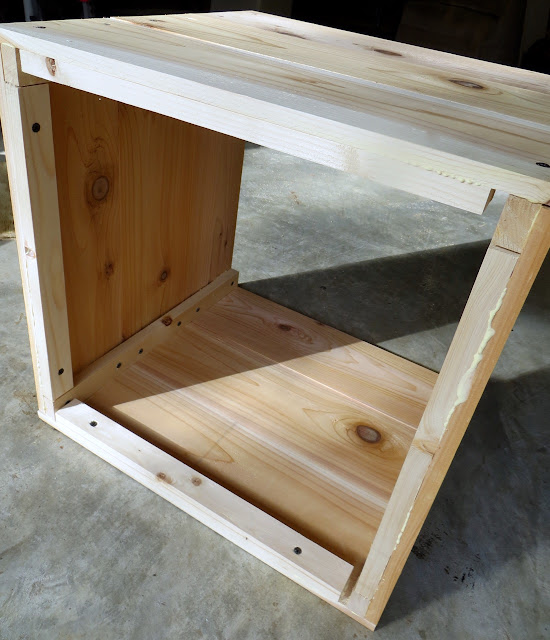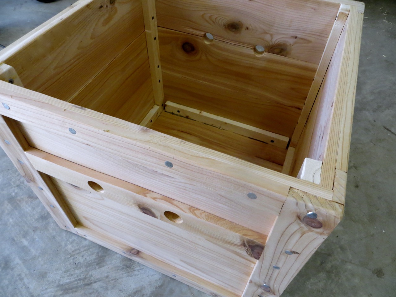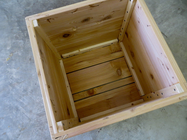 I added more 2×4 strips around each side of the bottom of my box to give me something to screw my bottom boards to. Measure and cut as you go. Glue, pre-drill + screw using 1″ screws.