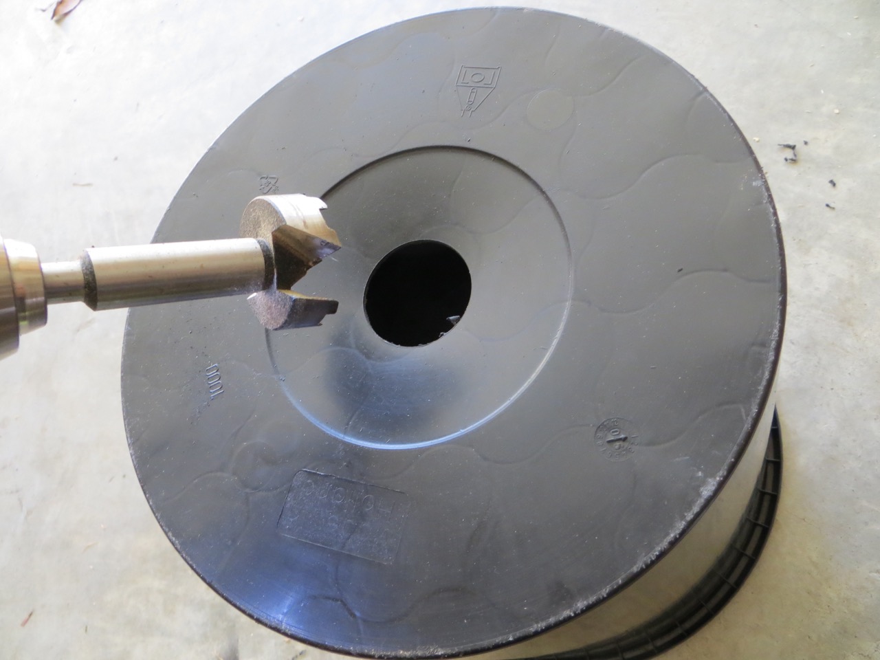 I used a 2″ forstner bit to carefully drill a hole in the center that my tube could fit through (you want it to be snug). TIP: wedge some scrap wood underneath the area you are drilling to avoid your plastic from cracking under the stress.
