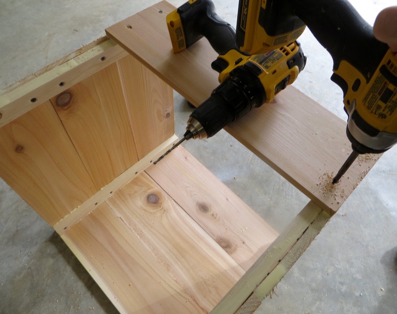 Glue your 15-3/4″ pieces on the sides of your boards and use a square to make sure they create a 90-degree angle from the bottom edge of your cedar boards. Pre-drill and screw 1″ screws along wood strip (I did 2 screws for each cedar board end – see pic below).