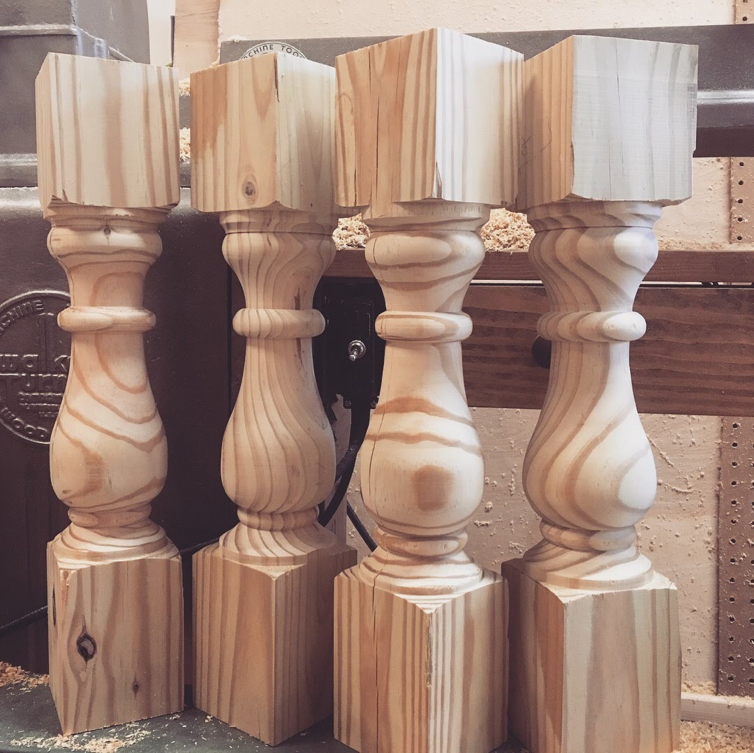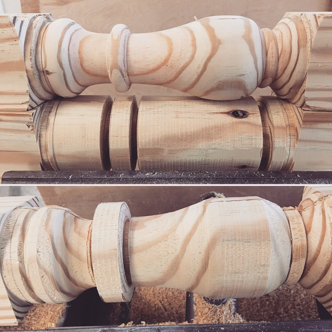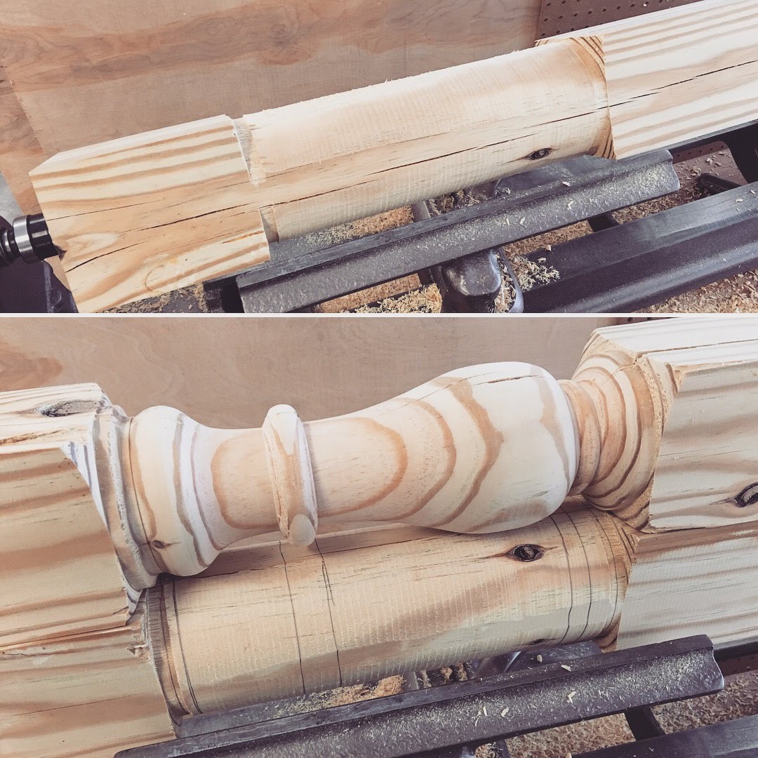 I started with the legs by using the 4×4’s that I machined down to 3×3. I’m new to turning so I cut slowly and reworked everything over and over until it looked/felt right – some parts were rough but overall I was super excited! I cut the post down to a final 18″ length.