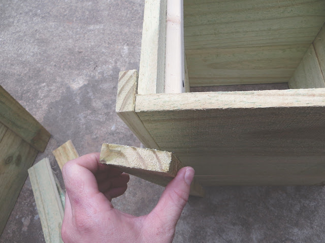 Now it’s time to cut your 1×2 furring strip for the ledge the plastic planter box will rest on. I didn’t measure for this either… just cut, fit, cut more, fit, cut more if needed, etc. Once you get one side to the size you want (how ever low you want the planter to sit in) then you cut the opposite side the same size. For the other ends cut them about 1-1/2″ shorter (er on the side of caution and cut them slightly longer and you can always cut shorter if needed). Note: you’ll want your 3.5-degree angles for these boards as well to get a snug fit!