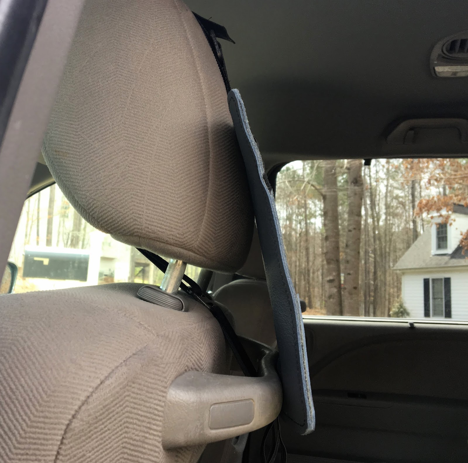 Test fit the mount on your headrest to ensure your long strapping is the right length. I had my bottom strap go underneath and through the handle on the back of the seat where the top strap went through it’s slide…