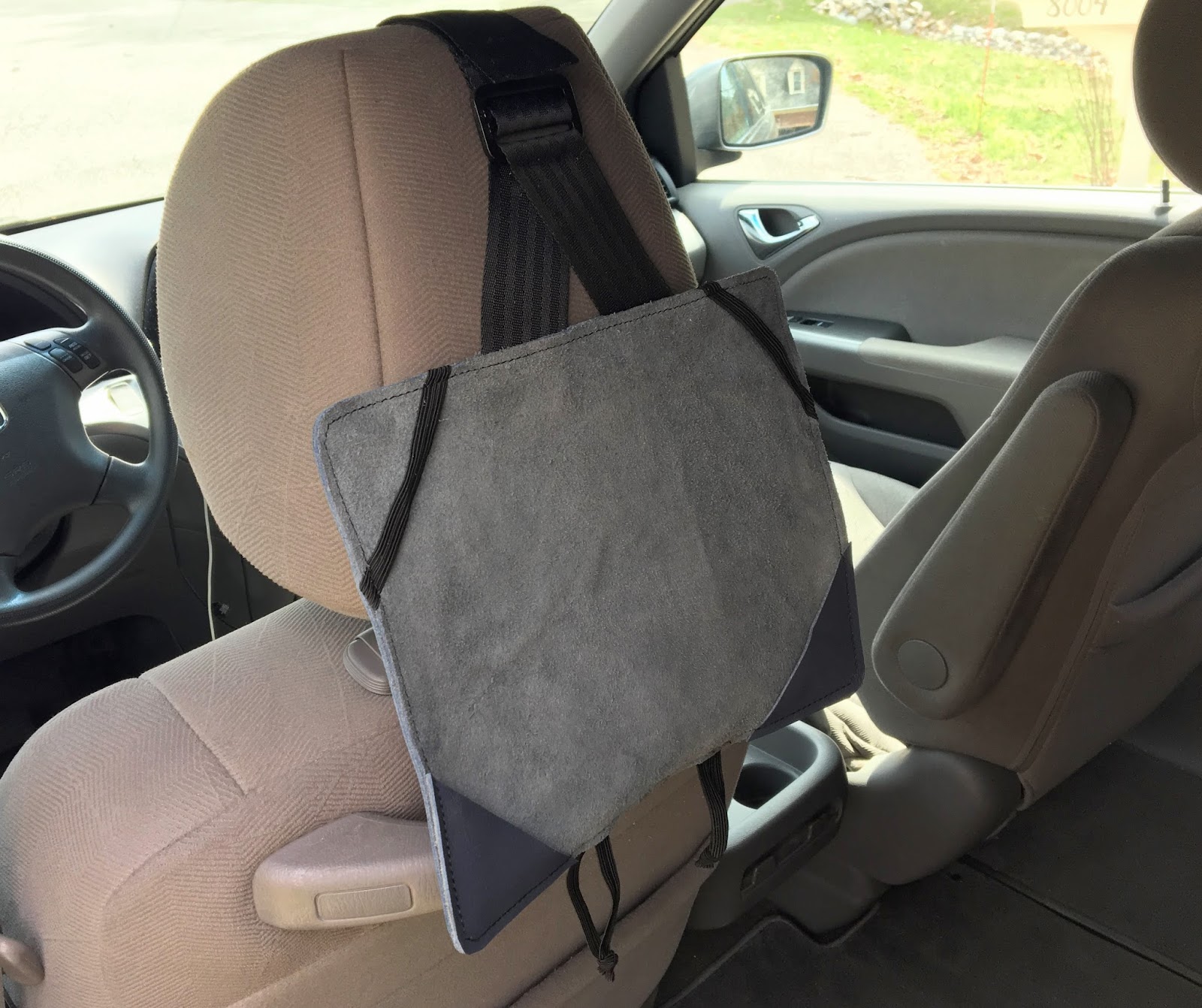 It’s solid, stays put and we didn’t even notice it was on the headrest while driving. The bluetooth speaker is held in place underneath with elastic loops – totally optional!