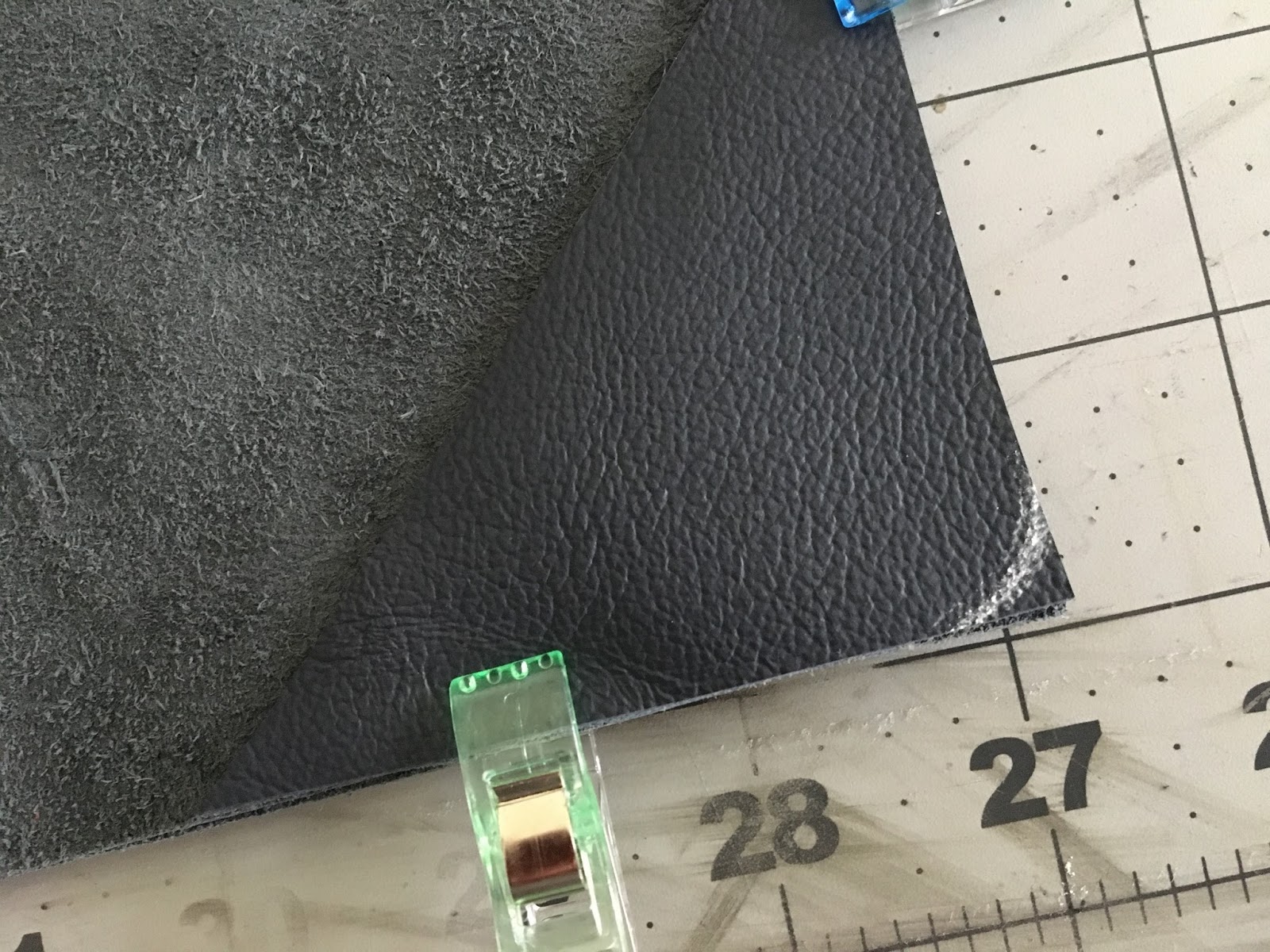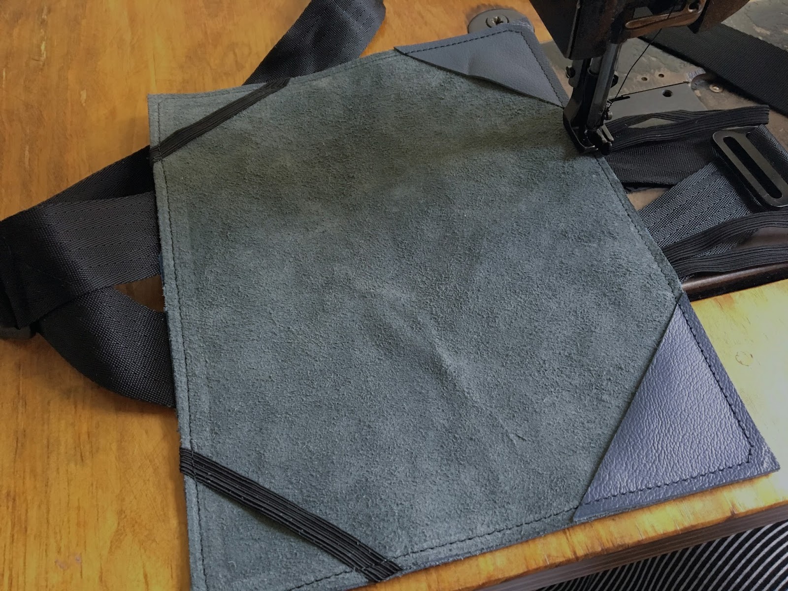 For the top corners you will place a piece of elastic across, being 2-1/2″ inward from the corner. I pulled apart the leather layers slightly to stick the ends of elastic inbetween. TIP: Have the ends of elastic at least 1/2-inch inside to ensure they get sewn in well.